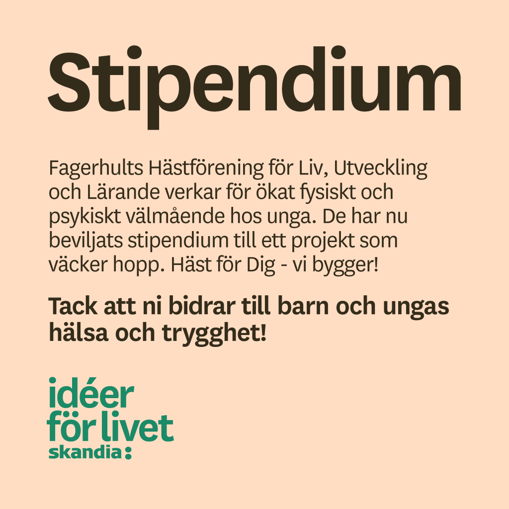 Projektet Häst för Dig – Framåt för Evigt genomfördes som en sammanslagning av delvis beviljade projektansökningar; Häst för Dig – Vi bygger och Häst för Dig – Nya vägar. Föreningen är fantastiskt tacksam till Skandia Stiftelsen Ideér för Livet samt till Ulla och Lennart Wallenstam Stiftelse för att kunnat erbjuda möjligheter till ökad känsla av hopp och egenmakt för unga i utsatta livslägen!