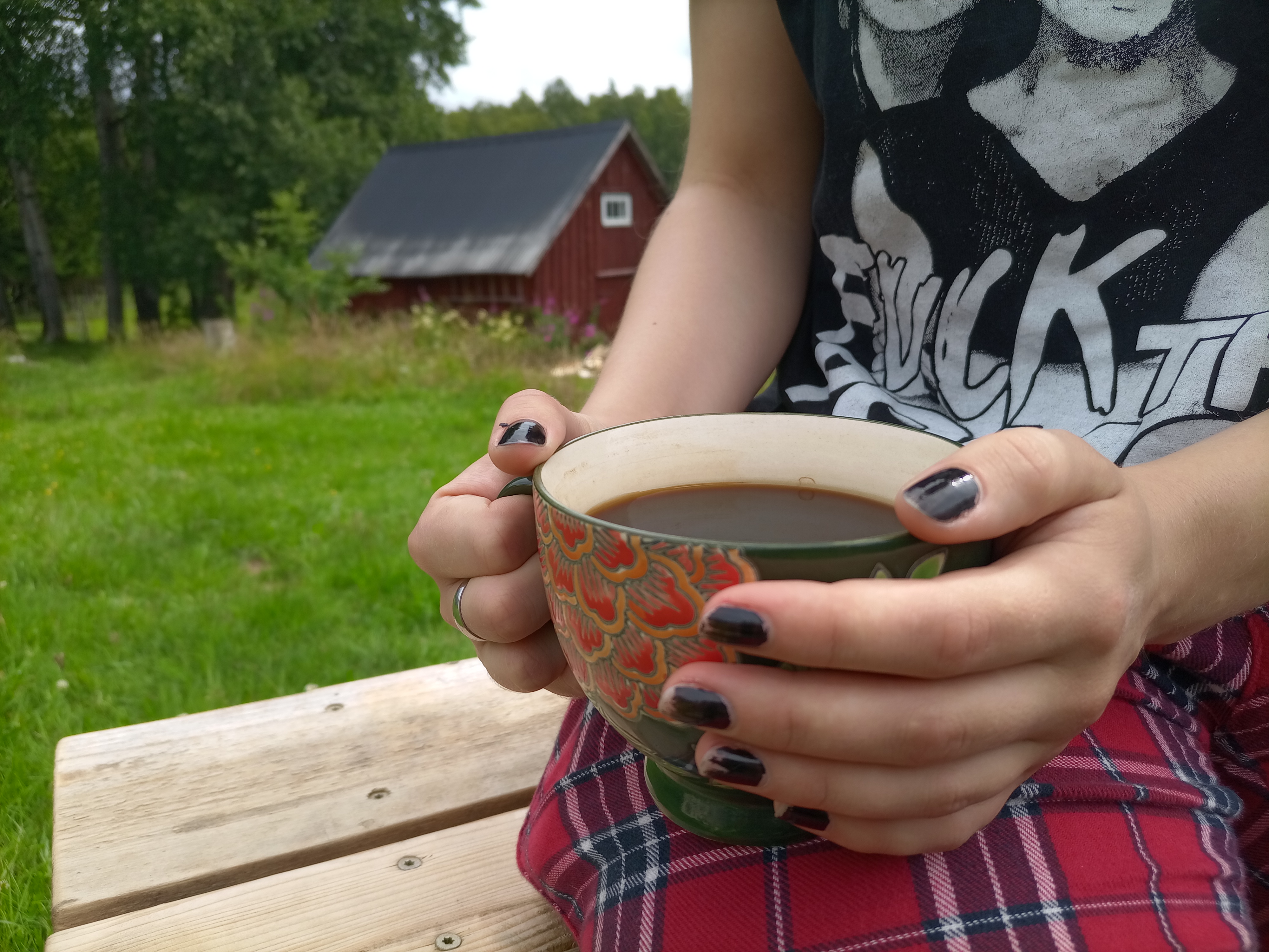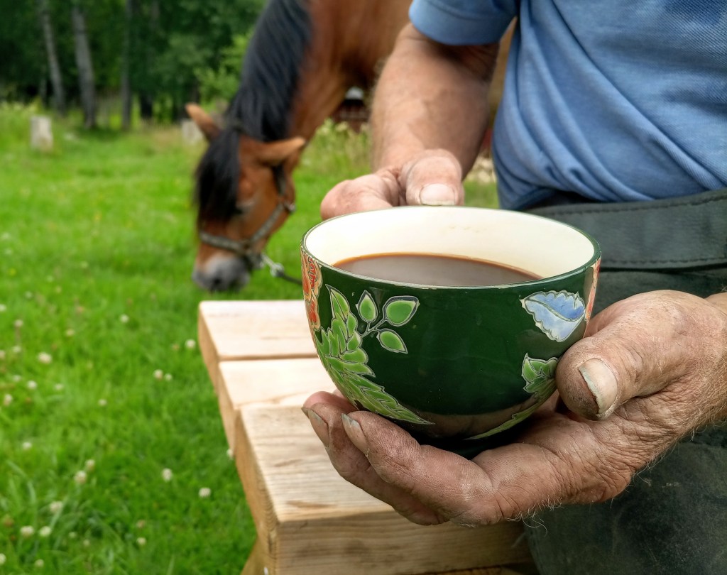 Varje tillfälle avslutas med en fika i vindskyddet. De dagar det är lite kallt eller regnigt tänder vi en brasa. Ofta brukar hunden Rex eller någon av katterna vilja vara med och fika. På gården finns, förutom katter och hund, fyra hästar, får, höns och ankor. Karin, som är handledare, är van att arbeta med människor tillsammans med djuren på gården för att bidra till hälsa och välbefinnande. Det går att göra övningar tillsammans med djuren för att lära sig mer om sig själv och andra. Det går också bra att hänga med djuren bara för att det är kul och mysigt.